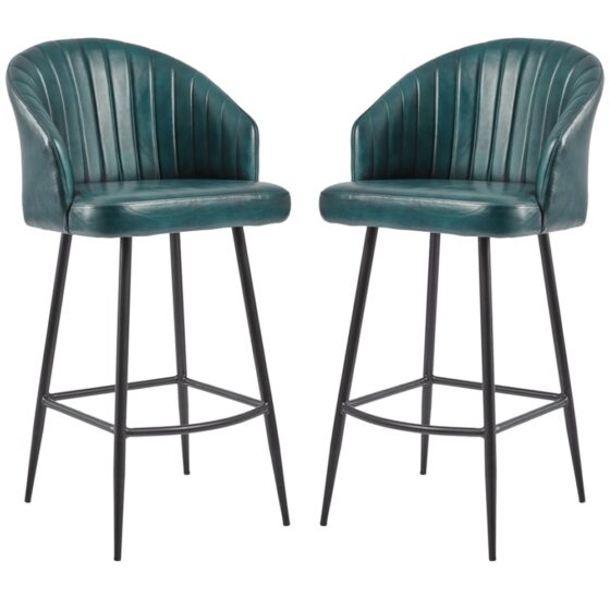 Add timeless elegance and comfort to your dining or bar space with the Furniture in Fashion Bakewell Vintage Blue Genuine Leather Bar Stools in Pair. Crafted with premium genuine leather in a warm Vintage Blue shade, these stools bring a sophisticated touch to any modern or classic interior. The sleek design, combined with durable construction, makes them a stylish and practical seating solution for everyday use. Perfect for kitchen islands, breakfast bars, or home entertainment areas, the Bakewell bar stools provide both stability and comfort. Their strong frame ensures durability, while the genuine leather upholstery offers a luxurious feel, making them the ideal choice for those who value both quality and style. Elevate your dining and entertaining space with the Furniture in Fashion Bakewell Vintage Blue Genuine Leather Bar Stools in Pair. Stylish, durable, and comfortable, these stools combine premium quality with timeless charm. FEATURES : Material : Genuine Leather, Metal Finish : Vintage Blue, Black The Bakewell Bar Stool is manufactured in genuine leather Featuring an attractive ribbed backrest and sleek tapered legs, it is a great addition to any venue It is constructed with a sturdy, black powder-coated iron frame for ultimate durability and is fitted with floor protectors The Bakewell Bar Stool is ideally suited to indoor venues The beautiful leather used in this product maintains its original characteristics and, as such, may have a natural uneven colour and growth marks Upholstery : Premium genuine leather in a rich Vintage Blue finish Design : Modern yet timeless silhouette to complement versatile interiors Frame : Sturdy construction ensures stability and long-lasting use Comfort : Ergonomic seating with supportive cushioning Available at an affordable price Images shown are for illustration purpose only DIMENSIONS : Height : 103cm Width : 51cm Depth : 62cm Seat Height : 75cm